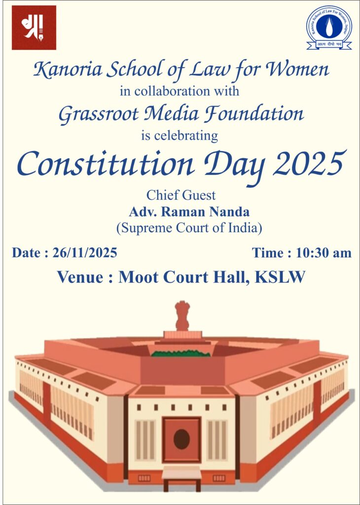 Kanoria School of Law for Women will be celebrating Constitution Day in collaboration with Grassroot Media.The programme will begin at 10:30 AM in the Moot Court Hall. The Chief Guest of the event will be Advocate Raman Nanda, Advocate, Supreme Court of India, and the session will be presided over by Dr. Sunil Mehrotra, Retired, Director General of Police.